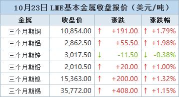 伦敦时间10月23日17:00(北京时间10月24日00:00),LME三个月期铜上涨191美元,或1.79%,收报每吨10,854美元,盘中高见10月9日以来最高价位10,876美元。