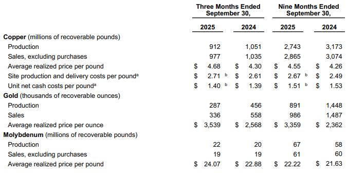 第三季度,自由港公司的铜产量为9.12亿磅,低于去年同期的11亿磅,产量减少的原因包括自2025年9月PTFI发生泥石流事故以来暂时停产,以及印尼的矿石品位降低。