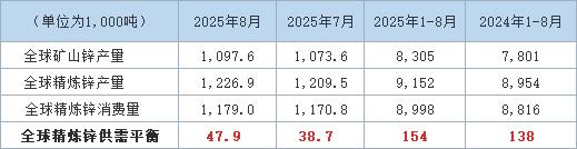 2025年1-8月全球精炼锌供应过剩量为154,000吨,上年同期为供应过剩138,000吨。
