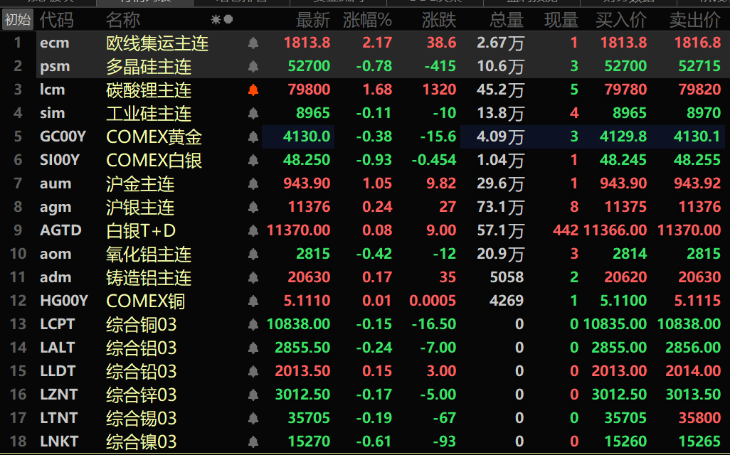 此外,铸造铝主连期货涨0.17%,氧化铝主连跌0.42%。碳酸锂主连涨1.68%,工业硅主连跌0.11%。多晶硅主连跌0.78%。