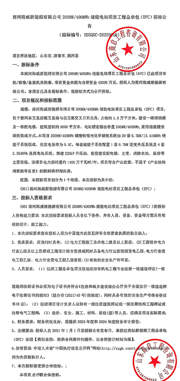 10月23日,商河海威新能源有限公司200MW/400MWh储能电站项目工程总承包(EPC)招标公告发布。项目位于山东省济南市商河县,本项目200MW/400MWh磷酸铁锂电化学储能系统由20套6.7MW/13.416MWh储能子系统组成。每套储能子系统配置1套6.7MW逆变升压系统及4套3.354Mh 直流电池系统。新建 220kV升压站,配套建设配电楼、主变、消防水池、泵房等主要设施。该项目电力消耗量约1400万千瓦时/年。项目符合产业政策,不于《产业结构调整指导目录》的限制类和淘汰类。