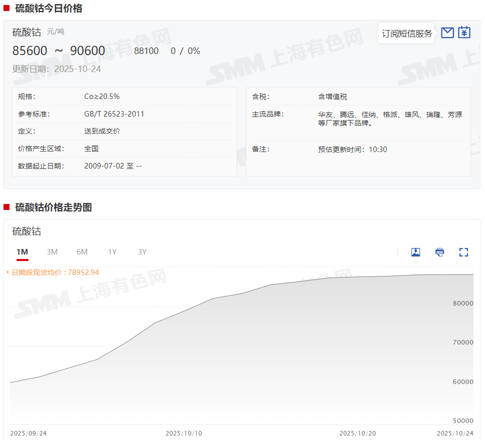 据SMM现货报价显示,本周硫酸钴现货报价也呈现接连上涨的态势,不过涨势相较前几周已经明显减缓,在10月24日终于“歇了一口气”,报85600~90600元/吨,均价报88100元/吨,较10月17日上涨850元/吨,涨幅达0.97%。