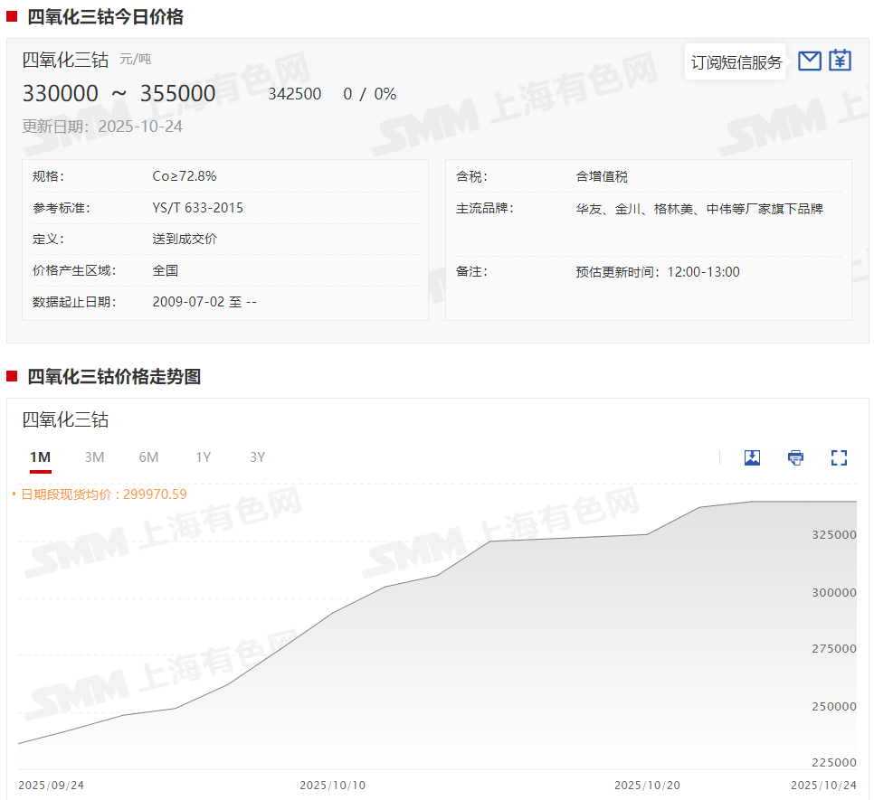 据SMM现货报价显示,本周四氧化三钴现货报价也整体较上周继续上涨,在本周最后两个交易日暂稳,截至10月24日,四氧化三钴现货报价暂时持稳于33~35.5万元/吨,均价报34.25万元/吨,较10月17日上涨15500元/吨,涨幅达4.74%。