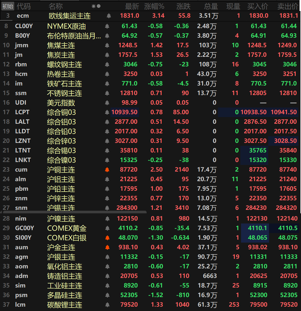 此外,碳酸锂主连涨1.33%,多晶硅主连跌1.52%,工业硅主连跌0.61%,欧线集运主连涨3.14%报1831。
