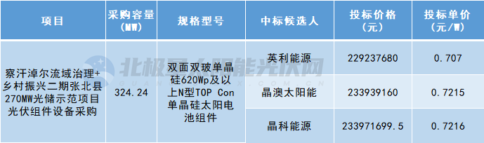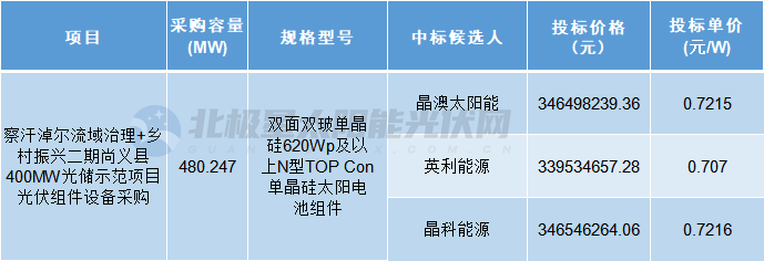 尚义县项目直流侧装机480.24704MWp,中标候选人为晶澳太阳能、英利能源、晶科能源。
