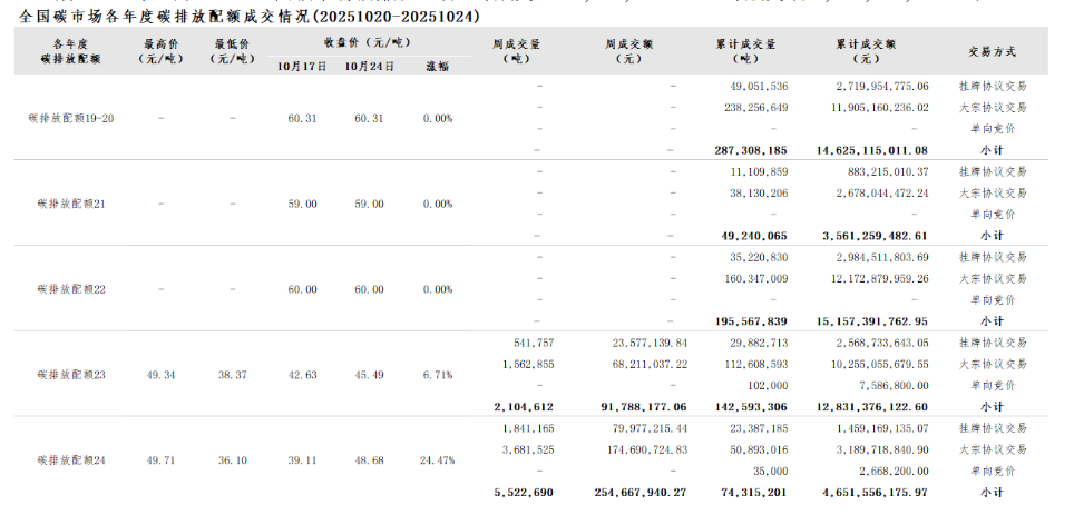 2025年1月1日至10月24日,全国碳市场碳排放配额成交量118,755,932吨,成交额7,793,971,451.70元。