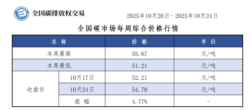 本周全国碳市场综合价格行情为:最高价55.67元/吨,最低价51.21元/吨,收盘价较上周五上涨4.77%。