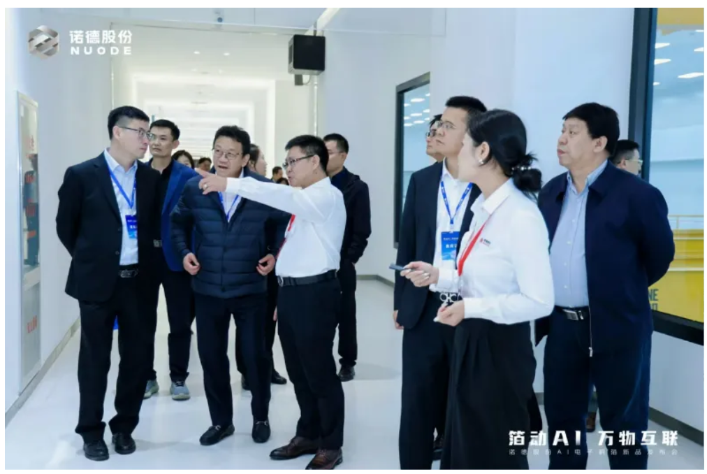 签约仪式结束后,嘉宾们实地参观了诺德股份智能化铜箔生产线,全面考察了从电解箔制造、表面处理到在线检测的全流程运作。公司构建了以“设备为基、流程为纲、证书为证、ESG为翼”为核心的全维度质量管理体系,并在各环节配置高端检测与过程控制设备:使用美国赛默飞ICP等离子发射光谱仪严格检测微量金属元素含量,依托日本电子JSM-IT100扫描电镜精准分析铜箔表面形貌,借助在线式自动厚度扫描仪实现微米级厚度管控,并引入在线CCD检测设备对铜箔表面进行实时缺陷侦测与分类。这些系统化的软硬件配置,全面展现了诺德股份在原材料控制、制程精度与产品一致性方面的高标准管控能力,参观嘉宾给予高度评价。