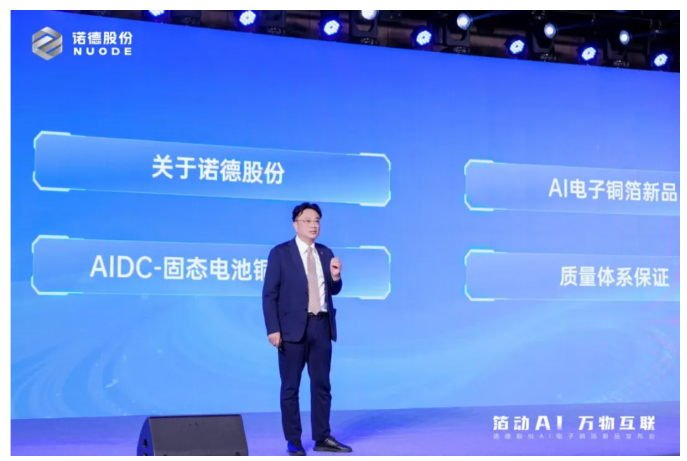 作为发布会核心环节,诺德股份总裁陈郁弼正式发布专为AI场景打造的全系列电子铜箔新品。针对AI服务器、先进封装等领域对高频高速、高密度、低延时、高散热的严苛要求,诺德股份推出NE-RTF、NE-HVLP、NE-VLP厚铜、载体可剥离/极薄铜箔四类主力电子铜箔产品,并同步推介储能锂电池用铜箔与固态电池专用镀镍合金箔,全面展现公司在高端铜箔领域的技术积累与前瞻布局。