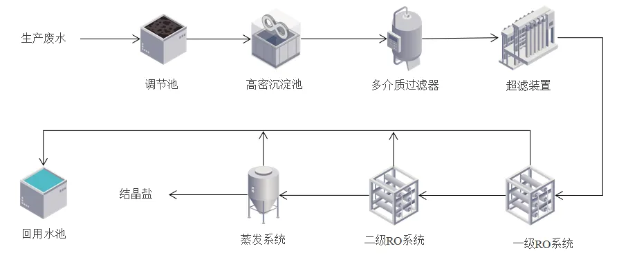 钠法制取磷酸铁工艺所产生的酸性废水,以硫酸根(SO₄²⁻)与钠离子(Na⁺)为主,并含有少量氯离子、钙镁离子。相较于氨法工艺,其废水总量显著减少。针对该废水特性,处理系统以资源回收与分级回用为核心目标,结晶出盐以硫酸钠为产品,回用水根据用水需求可处理电导率<10μS/cm满足生产工艺用水要求,也可电导率<1000μS/cm满足循环水补水要求。
