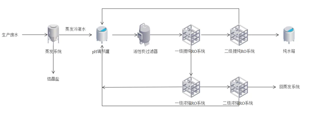 在三元前驱体制备的过程中,因生产过程产生含氯化铵、硫酸铵、硫酸钠等不同组分的废水,需要经过前处理后进入蒸发设备实现盐分的回收,对其蒸发冷凝水进行浓缩纯化,最终浓缩液回流到前端蒸发设备中消纳,纯化后的纯水满足电导率<10μS/cm回用至生产。