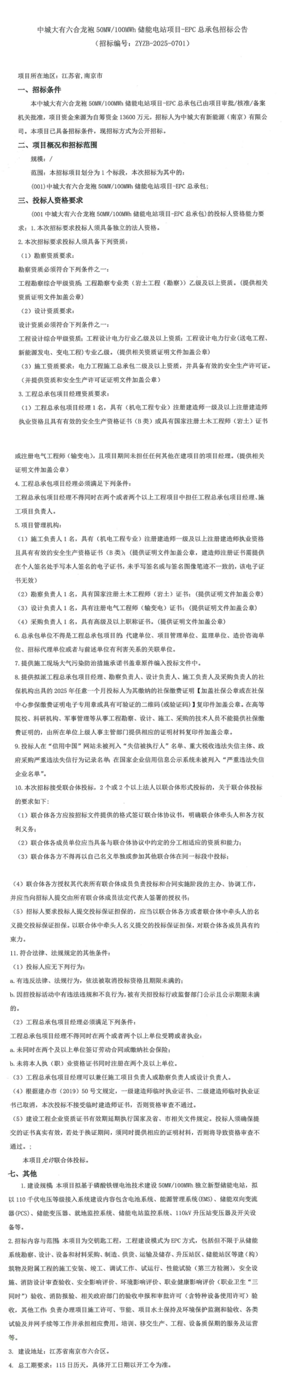 10月24日,中城大有新能源(南京)有限公司发布中城大有六合龙袍50MW/100MWh储能电站项目-EPC总承包招标公告。项目位于江苏省南京市,项目拟基于磷酸铁锂电池技术建设50MW/100MWh独立新型储能电站,拟以 110千伏电压等级接入系统建设内容包含电池系统、能源管理系统(EMS)、储能双向变流器(PCS)、储能变压器、就地监控系统、储能电站监控系统、110kV升压站变压器及开关设备等。