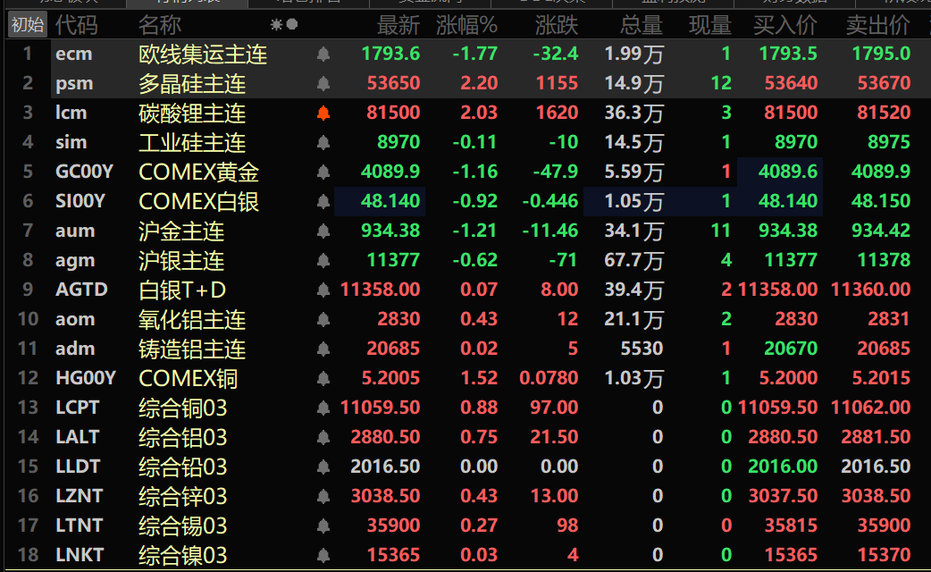 此外,铸造铝主连期货微涨,氧化铝主连涨0.43%。碳酸锂主连涨2.03%,工业硅主连跌0.11%。多晶硅主连涨2.2%。