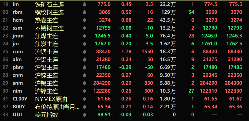 截至午间收盘,内盘基本金属近全线上行,沪铜涨1.78%。沪铝涨0.24%,沪铅跌0.29%,沪锡涨0.29%,沪镍涨0.25%,沪锌涨0.27%。
