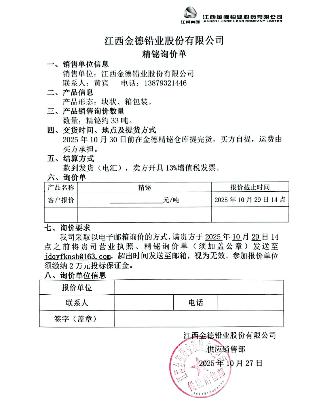 近期,江西金德铅业股份有限公司发布精铋询价单,销售精铋数量约33吨,要求2025年10月30日前在金德精铋仓库提完货,买方自提,运费由买方承担。