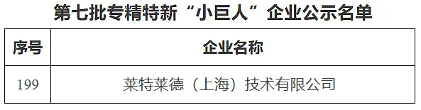 近日,上海市第七批专精特新“小巨人”企业名单公示,莱特莱德(上海)技术有限公司凭借在专业技术、创新能力、市场地位及质量管理体系等方面的卓越表现,成功入选,荣获国家级专精特新“小巨人”企业认定。