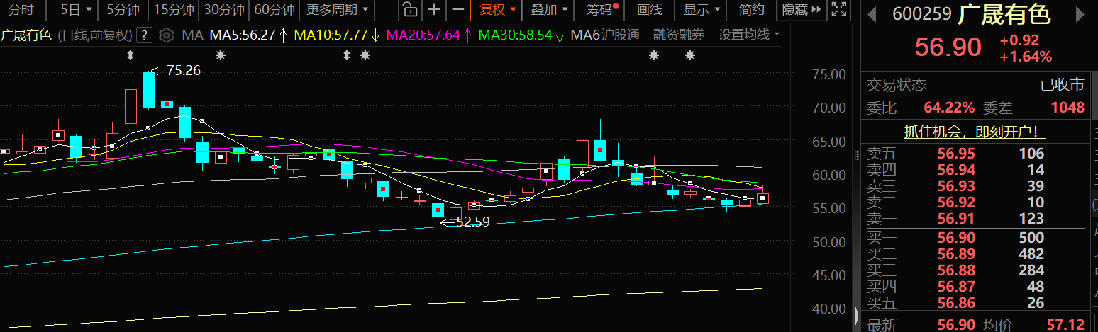 10月27日,广晟有色股价出现上涨,截至27日收盘,广晟有色涨1.64%,报56.9元/股。