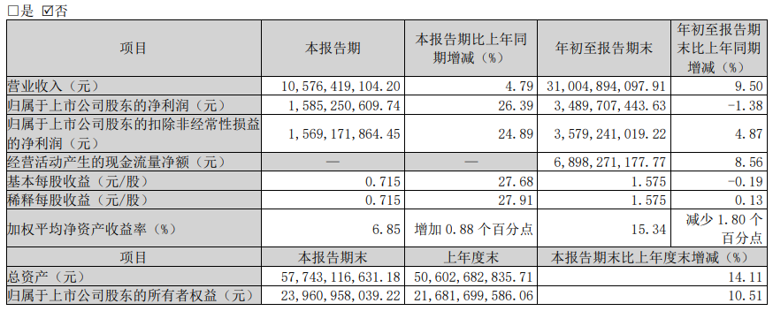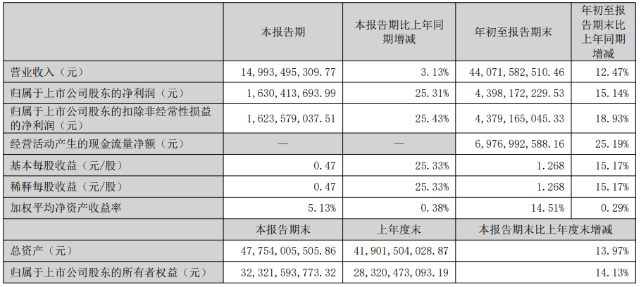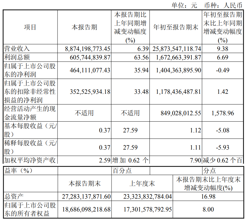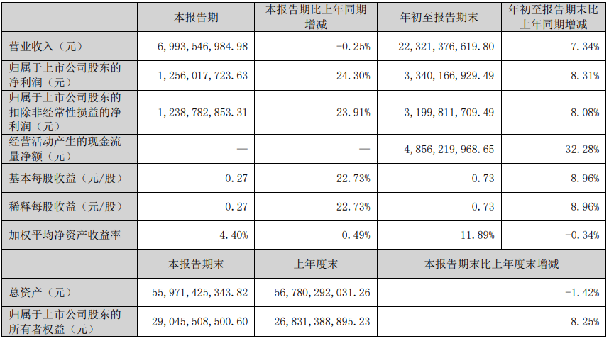 据公告显示,天山铝业第三季度共实现69.94亿元的营收,同比下降0.25%;第三季度归属于上市公司股东的净利润为12.56亿元,同比增长24.3%;前三季度共实现223.21亿元的营收,同比,同比增长7.34%;归属于上市公司股东的净利润33.40亿元,同比增长8.31%。