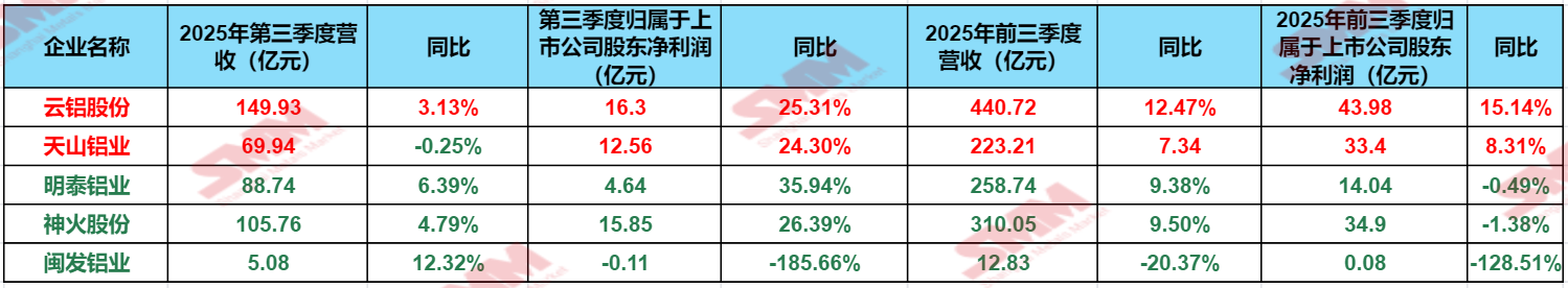 SMM 10月27日讯:近期,不少铝产业链相关企业陆续发布其2025年前三季度业绩报告,从公告来看,企业业绩增减不一,SMM整理了以下几家铝相关企业的前三季度业绩情况,具体如下: