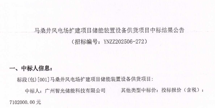 北极星储能网获悉,10月24日,马桑井风电场扩建项目储能装置设备供货项目中标结果公告,广州智光储能科技有限公司以710.2万元中标该项目,折合单价0.7102元/Wh。