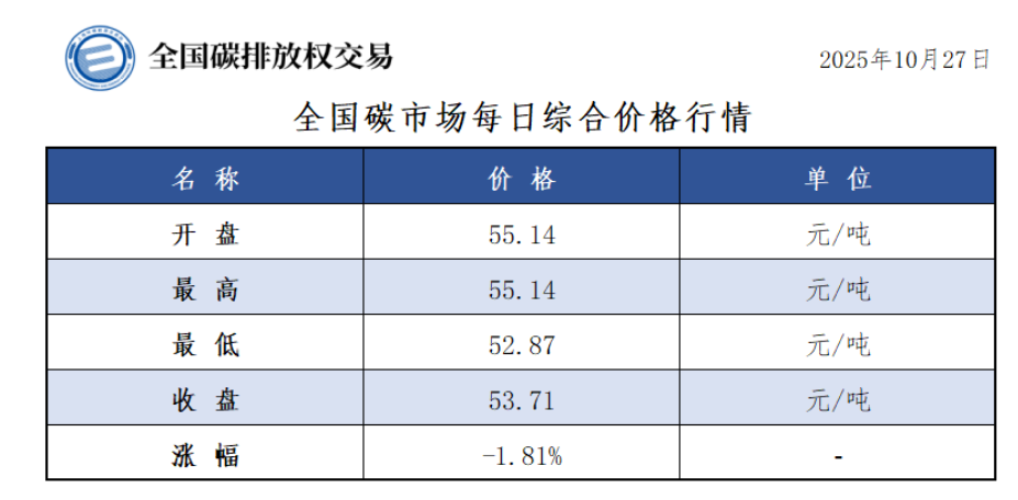 今日全国碳市场综合价格行情为: 开盘价55.14元/吨,最高价55.14元/吨,最低价52.87元/吨,收盘价53.71元/吨,收盘价较前一日下跌1.81%。