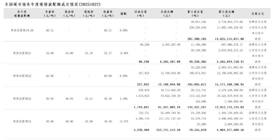2025年1月1日至10月27日,全国碳市场碳排放配额成交量126,134,514吨,成交额8,146,384,178.52元。