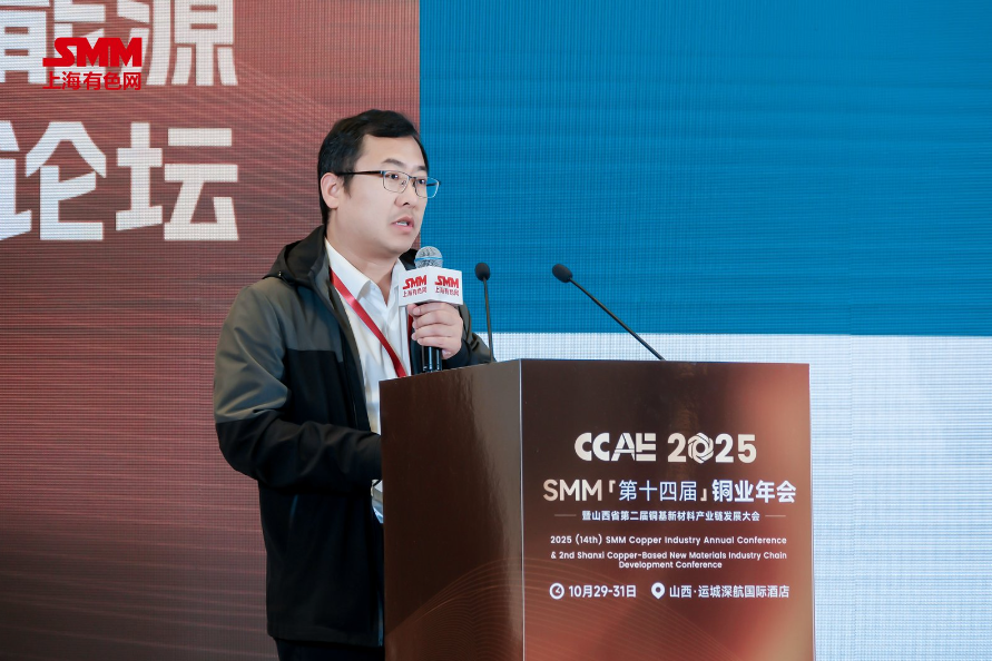 10月30日,在由上海有色网信息科技股份有限公司(SMM)、中条山有色金属集团有限公司主办的CCAE 2025 SMM(第十四届)铜业年会暨山西省第二届铜基新材料产业链发展大会——铜产业低碳能源转型论坛上,中国电科院碳评估室主任刘超分享了“电力设备产品碳足迹量化研究与实践”这一主题。
