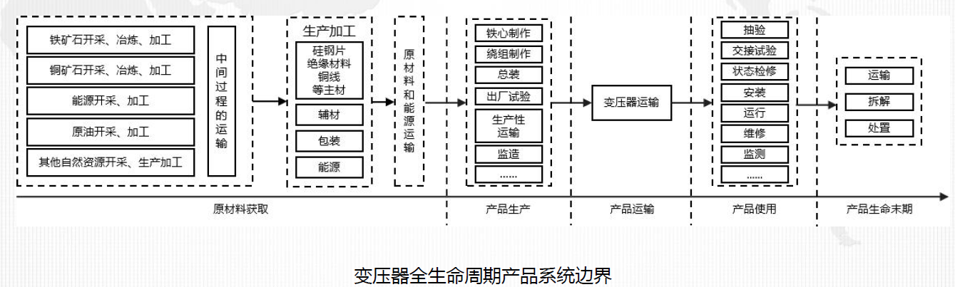 采用生命周期评价方法,根据GB/T 24067—2024《温室气体 产品碳足迹 量化要求和指南》要求,针对电力变压器制定系统边界,包括原材料获取、产品生产、产品运输、产品使用、产品生命末期五个阶段,并明确其产品碳足迹功能单位为1台变压器。