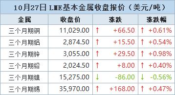 伦敦时间10月27日17:00(北京时间10月28日01:00),LME三个月期铜上涨66.5美元,或0.61%,收报每吨11,029.0美元,此前一度触及每吨11,094美元,为去年5月20日以来最高。