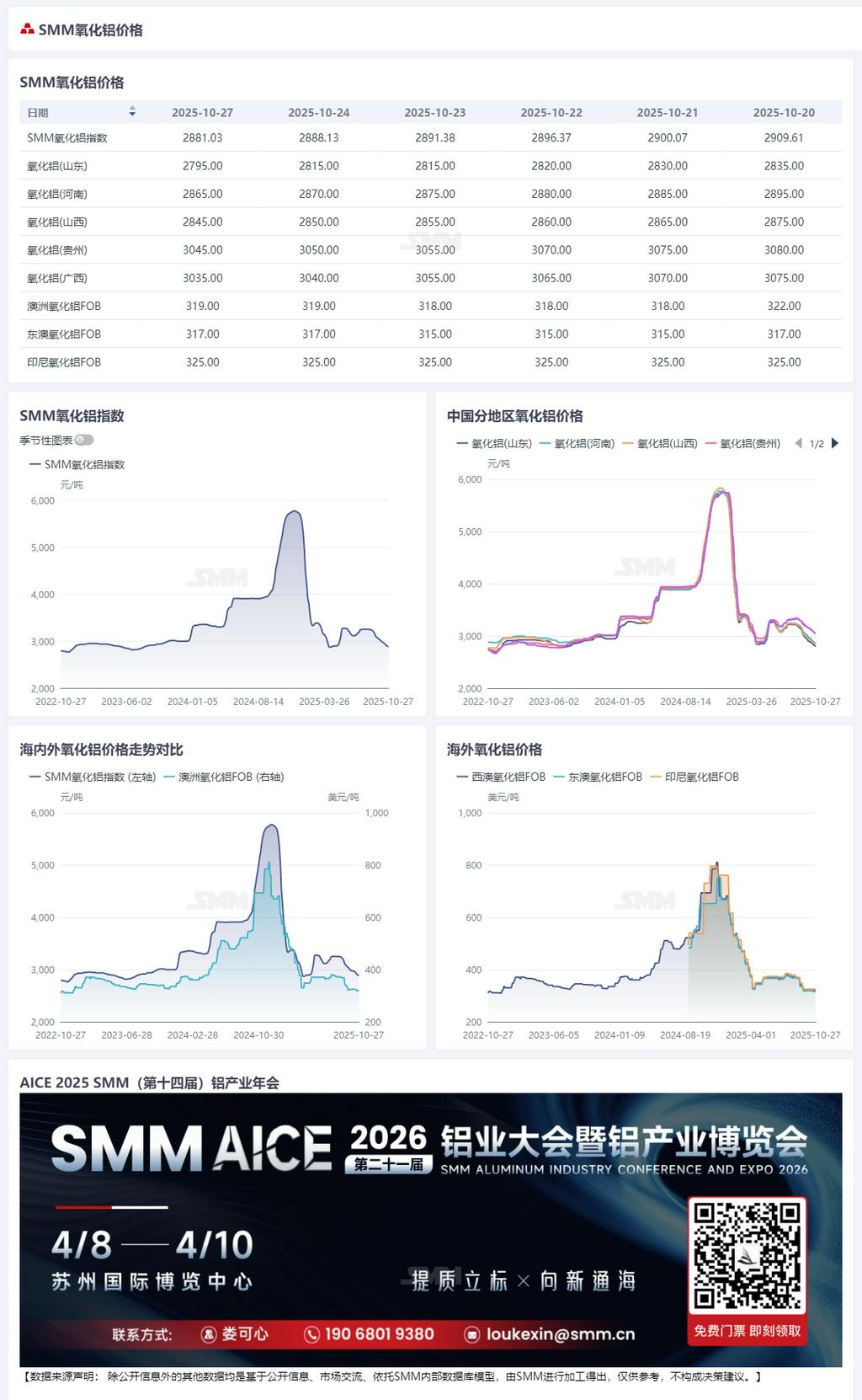 现货价格:截至2025年10月27日,SMM氧化铝指数报2881.03/吨,环比下跌-7.10元/吨;SMM山东氧化铝指数报2786.96元/吨,环比下跌2.78元/吨;SMM河南氧化铝指数报2860.61元/吨,环比下跌2.85元/吨;SMM山西氧化铝指数报2833.09/吨,环比下跌2.50元/吨;SMM贵州氧化铝指数报3017.77元/吨,环比下跌5.00元/吨;SMM广西氧化铝指数报3003.93元/吨,环比下跌-2.06元/吨。昨日北方地区询得两笔现货成交,价格均较网价贴水。