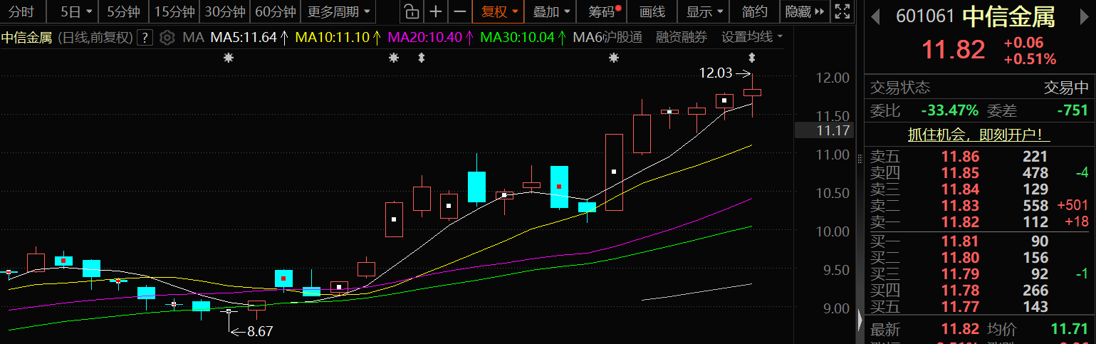 10月28日,中信金属延续前5个交易日的涨势继续上涨,截至28日10:27分,中信金属涨0.51%,报11.82元/股。