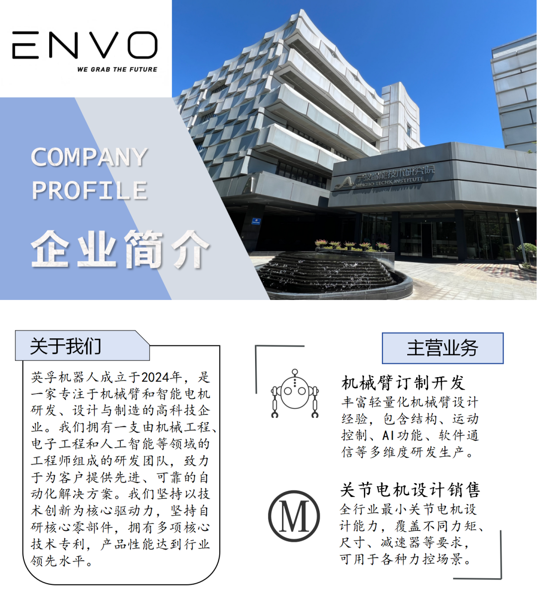 英孚机器人成立于2024年,是浙江省科技型中小企业,专攻于轻量化机器人及其关节电机的研发制造。依托自身强大的研发能力,英孚机器人不断迭代推出高性能产品,包括轻量化谐波系列一体化关节、摆线系列一体化关节、轻量化scara机械臂、轻量化六轴机械臂等。公司持续秉承以客户为中心,致力于成为全球轻量化机器人的优秀零部件及解决方案的供应商。