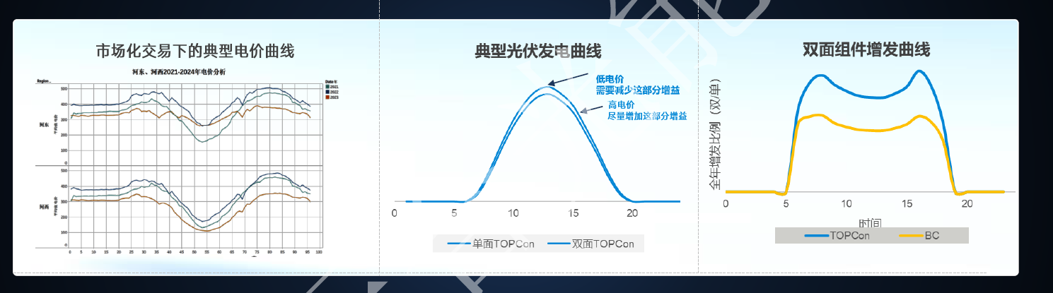 电力市场化背景下,由于光伏发电的时空特性,导致正午时段电价走低。为了符合市场化电价的趋势,需要优化早晚发电量的技术,才能有效的提升项目收益。双面率提升有助于早晚发电量的增加,更贴合新的市场环境。