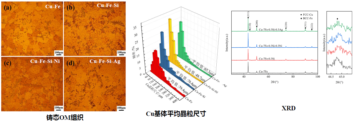 铸态组织和XRD:Si、Si-Ni和Si-Ag元素的添加促进了Fe相的形核及析出,但也使富Fe枝晶发生了粗化行为,表现为一次枝晶臂主干伸长,二次枝晶臂增多。随着合金化元素的添加,Cu基体平均晶粒尺寸减小。四组合金的XRD并无显著差别,是因为Si、Ni和Ag元素添加量较少,形成的衍射峰强度非常弱。