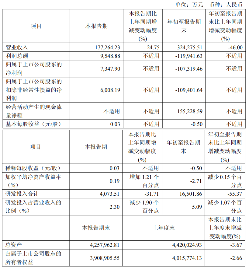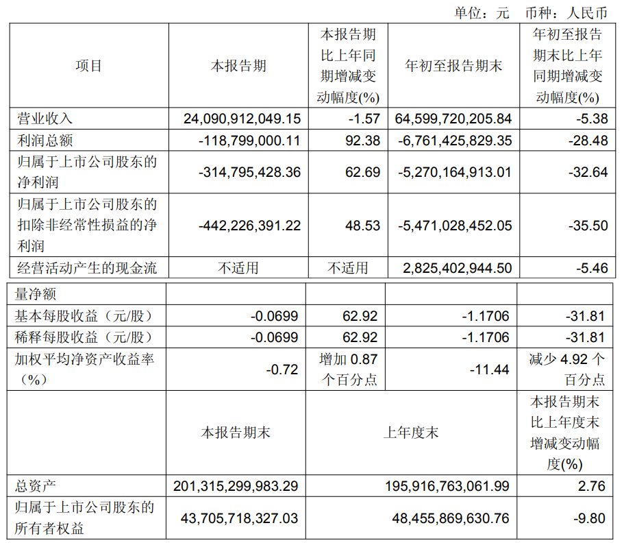 前三季度,公司共实现约32.42亿元的营收,同比下滑46%;前三季度归属于上市公司股东的净利润亏损约10.73亿元。