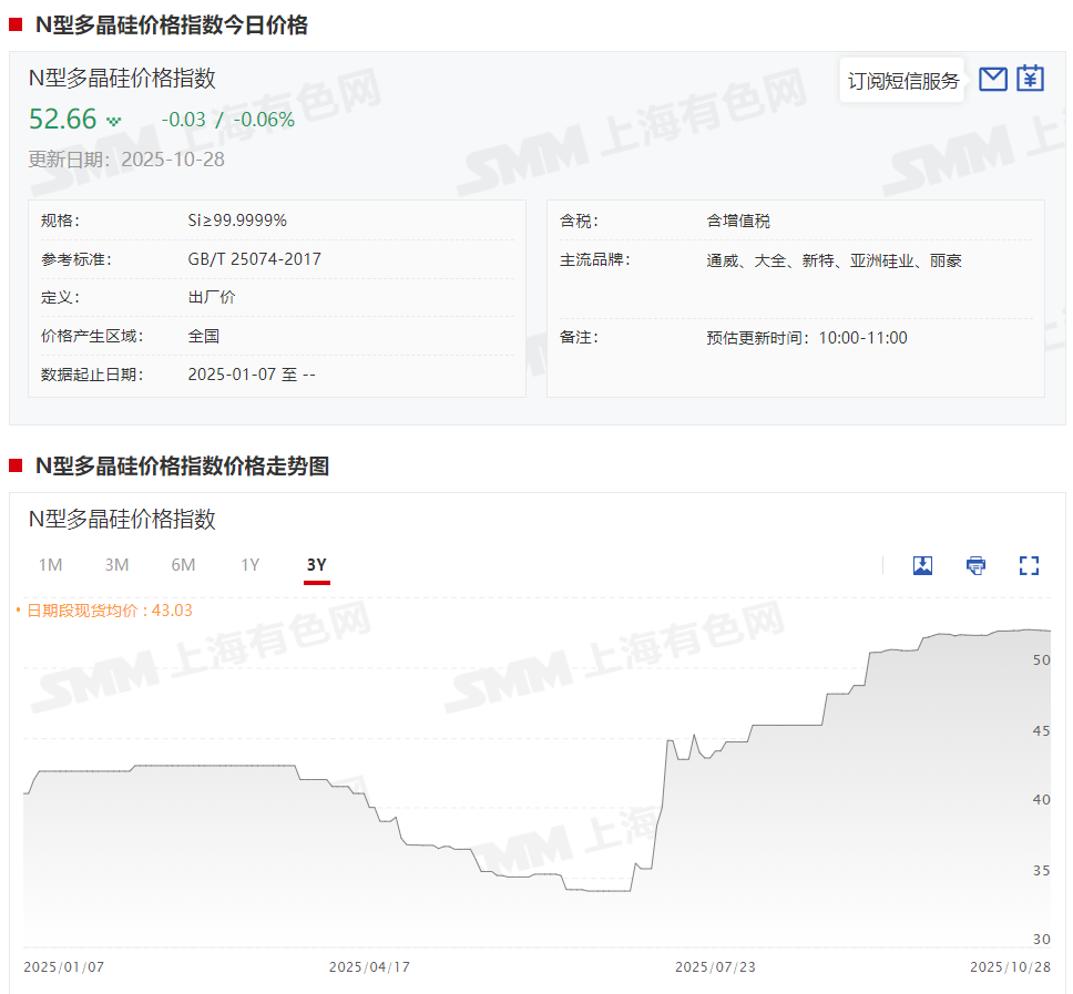 而进入10月份,多晶硅价格也维持在近期的相对高位附近,截至10月28日,N型多晶硅价格指数报52.66元/千克。对于10月份的产量预期,据SMM了解,10月多晶硅产量预计13.4万吨左右,环比9月出现增加,超出此前市场预期,11月部分头部企业将减产,产量有下滑预期。