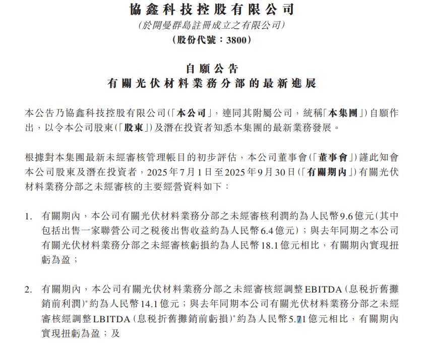 协鑫科技方面,据其公告显示,公司光伏材料业务成功扭亏,第三季度该业务录得约9.6亿元的利润,前一年同期亏损18.1亿元。对于其扭亏的原因主要有两个,一方面是多晶硅行业反内卷的情况,带动多晶硅价格上涨,公司第三季度颗粒硅平均外部含税售价为人民币42.12/公斤,较第二季度的32.93元/公斤显著上升;与此同时,协鑫科技的颗粒归平均生产成本(含研发成本)进一步下降至人民币24.16/公斤,较第一季度的27.07元/公斤持续优化。此外,协鑫科技出售了一家联营公司之税后出售收益约为6.4亿元。