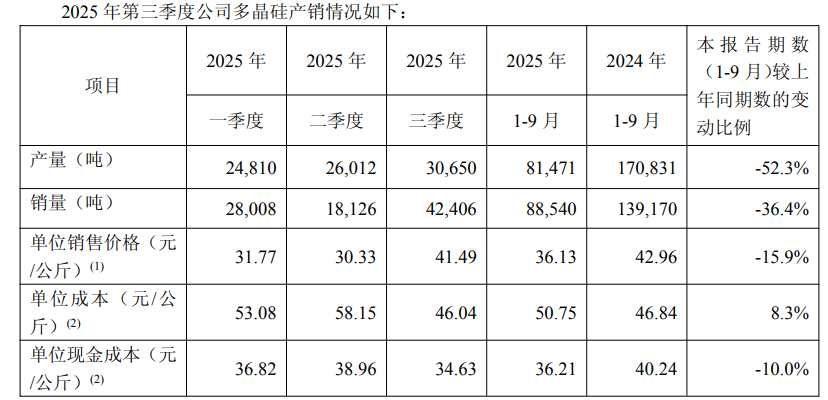 下图是大全能源第三季度公司多晶硅的产销情况,2025年前三季度公司多晶硅产量总计81471吨,相较2024年同期下降52.3%;前三季度多晶硅销量88540吨,相比2024年前三季度下降36.4%。大全能源表示,基于当前市场动态、产品价格及市场趋势的变化情况,结合年度例行检修计划进度,公司预计第四季度多晶硅产量 39,500-42,500 吨,2025 年全年预期产量为 121,000-124,000 吨。