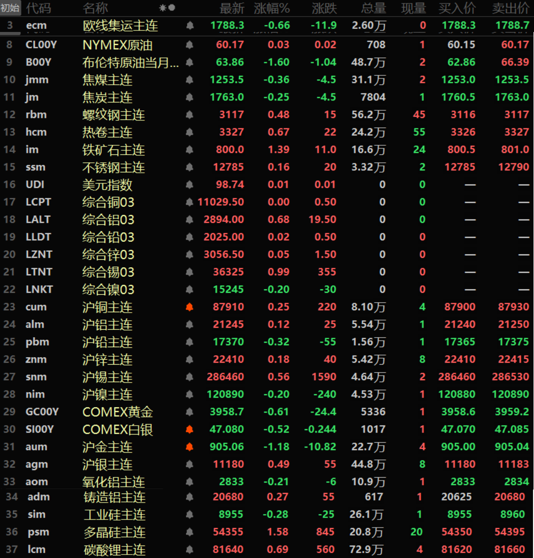 黑色系方面多上扬,铁矿涨1.39%,热卷涨0.67%,螺纹涨0.48%。双焦一同下跌,焦煤跌0.36%,焦炭跌0.25%。
