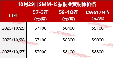 【SMM价格】2025年10月29日长振黄铜棒价格