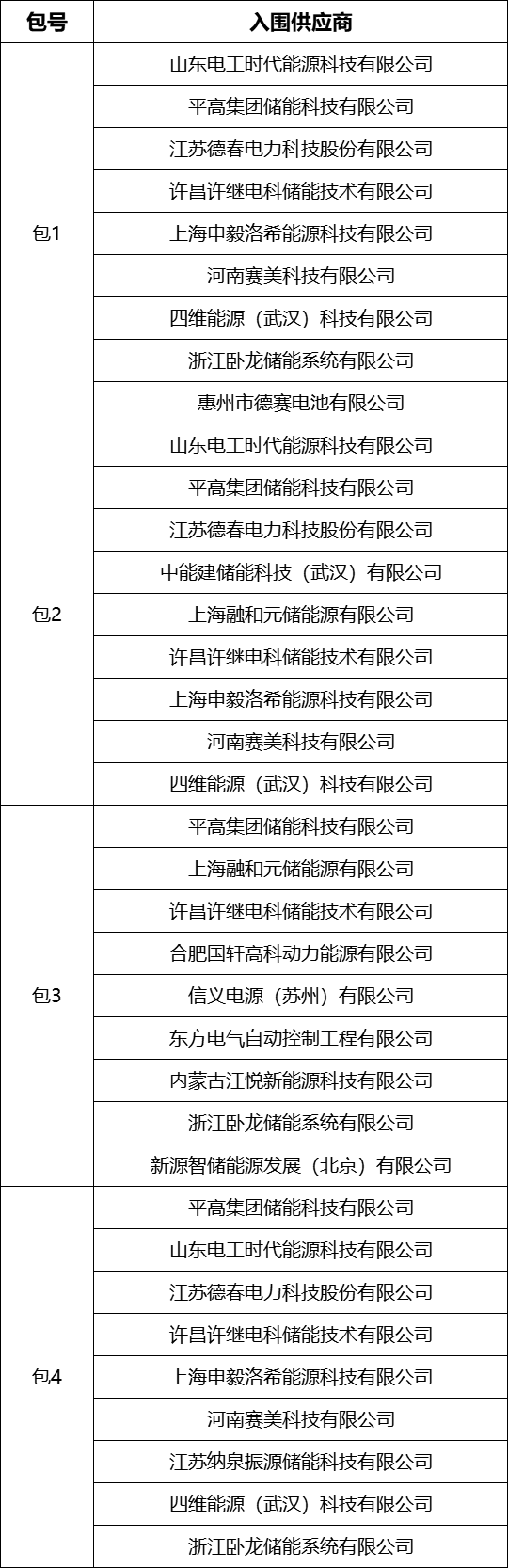 其中,包1共有企业9家,包括山东电工时代能源科技有限公司、平高集团储能科技有限公司、江苏德春电力科技股份有限公司、许昌许继电科储能技术有限公司、上海申毅洛希能源科技有限公司、河南赛美科技有限公司、四维能源(武汉)科技有限公司、浙江卧龙储能系统有限公司、惠州市德赛电池有限公司。