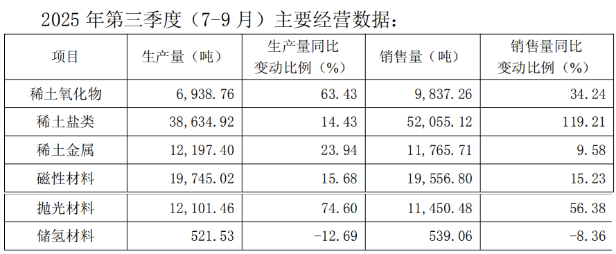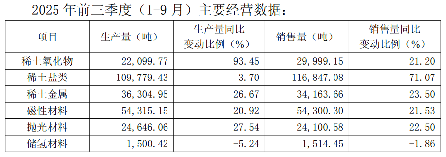 北方稀土在其三季报中披露的公司 2025 年第三季度(7-9 月)及前三季度(1-9月)主要经营数据披露如下: