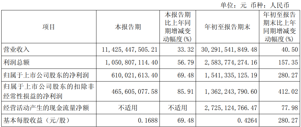 北方稀土10月28日披露2025年第三季度报告显示:公司前三季度实现营业总收入302.92亿元,同比增长40.50%;归母净利润15.41亿元,同比增长280.27%;扣非净利润13.62亿元,同比增长412.02%。