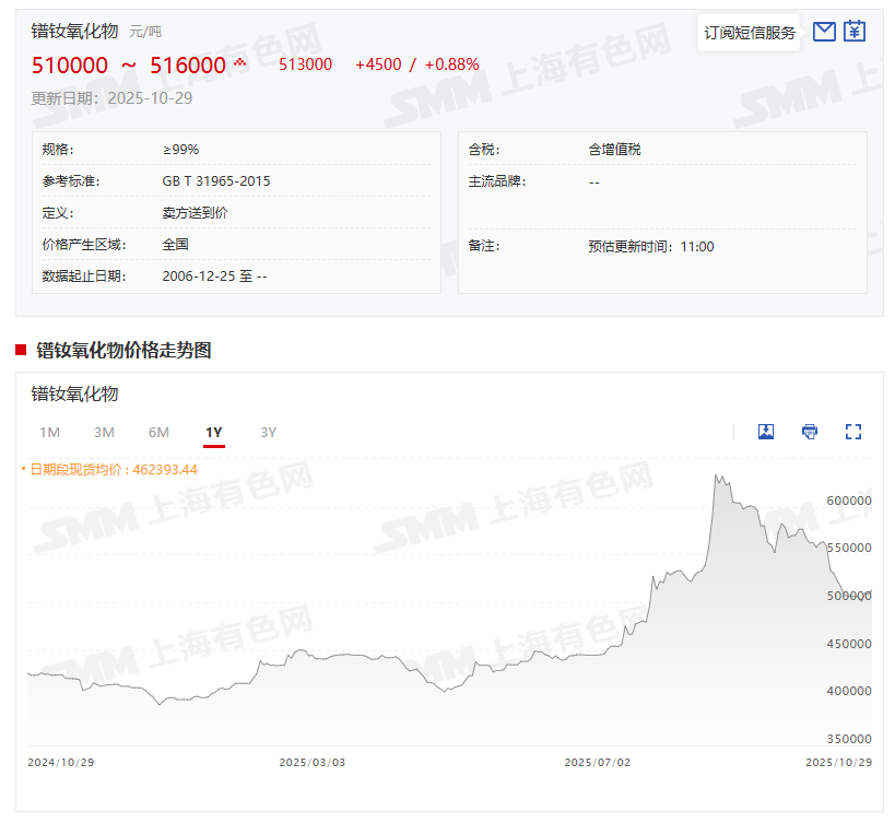 据SMM报价显示,氧化镨钕10月29日的价格为510000~516000元/吨,期均价为513000元/吨,较前一交易日上涨0.88%。