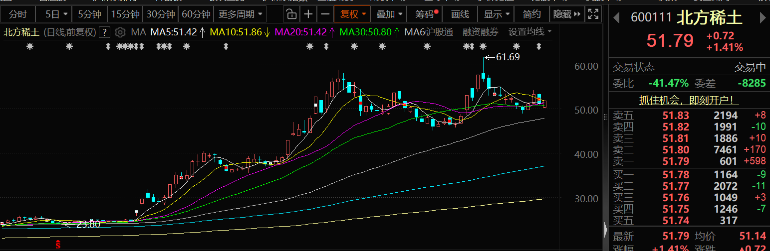 10月29日,北方稀土股价出现上涨,截至29日14:50分,北方稀土涨1.41%,报51.79元/股。