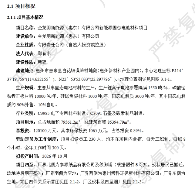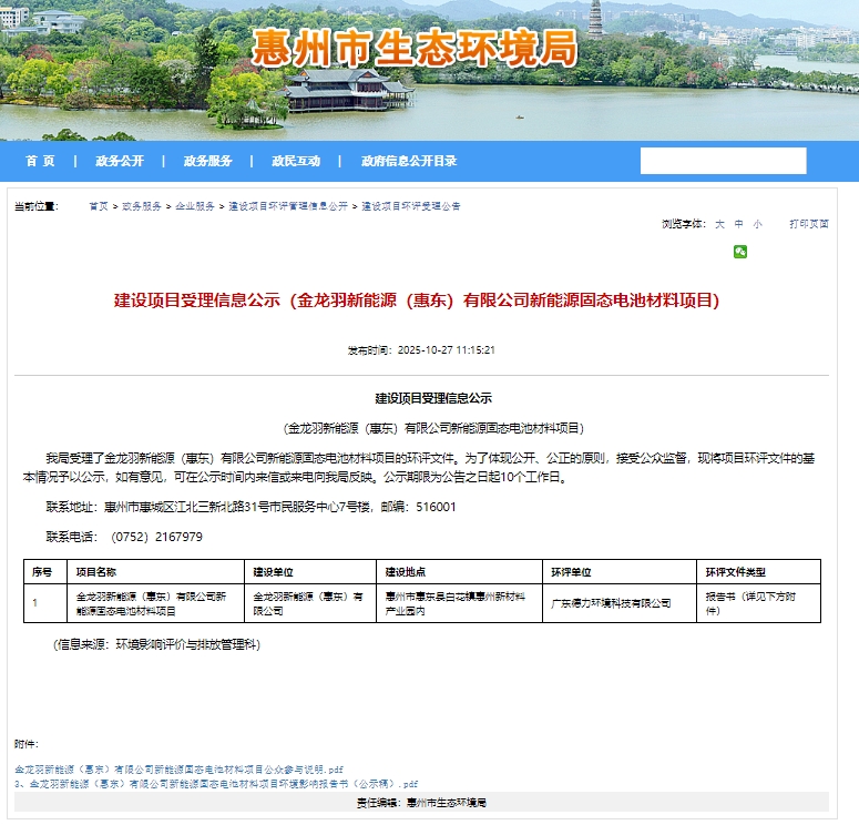 2025年10月27日,惠州市生态环境局就金龙羽新能源(惠东)有限公司新能源固态电池材料项目环评公示。项目地点:惠州市惠东县白花镇惠州新材料产业园内。