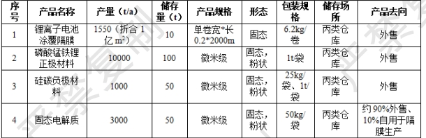 主要生产固态电池材料,其中正极材料:磷酸锰铁锂1万吨/年;负极材料:硅碳负极1000吨/年;电解质:固态电解质3000吨/年,90%外售、10%自用;隔膜材料:锂离子电池涂覆隔膜1550吨/年。