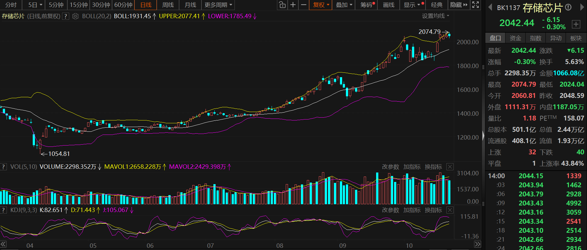 SMM 10月30日讯:自9月份以来,存储芯片行业便“涨声四起”,而在经过一个月的发酵之后,行业热度不降反增,甚至市场上还有消息称,目前部分Dram和Flash产品已停止报价,或者“一天一个价”。而存储芯片板块近几个交易日也是接连上涨,截至10月30日,存储芯片指数最高已经涨至2074.79的高位,刷新其指数上市以来的历史新高。