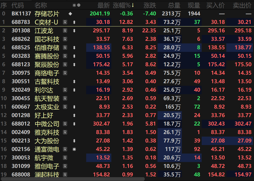 个股方面,江波龙盘中涨逾10%,股价最高一度冲至308元/股,同样刷新其上市以来的历史新高。聚辰股份、利尔达、商络电子、国芯科技等多股纷纷跟涨。