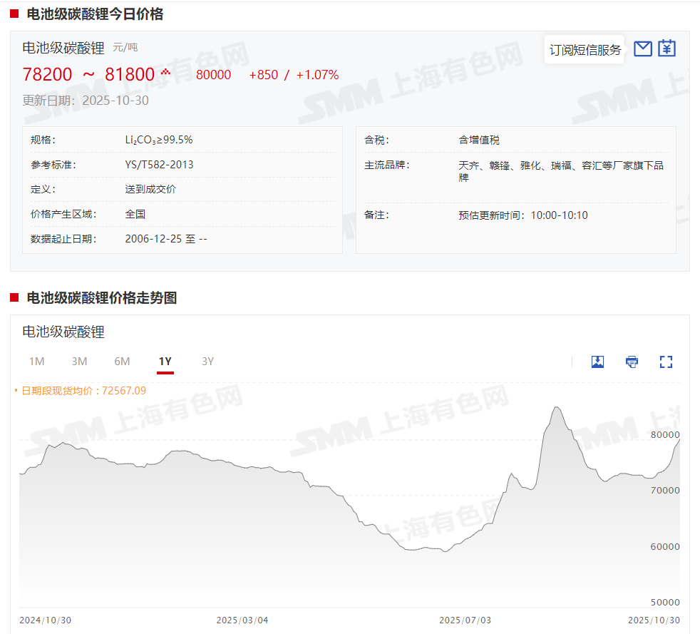 而在强劲的需求支撑下,近期碳酸锂期货也持续上涨,截至10月30日,碳酸锂期货主连以1.19%的涨幅报83400元/吨,录得七连涨。